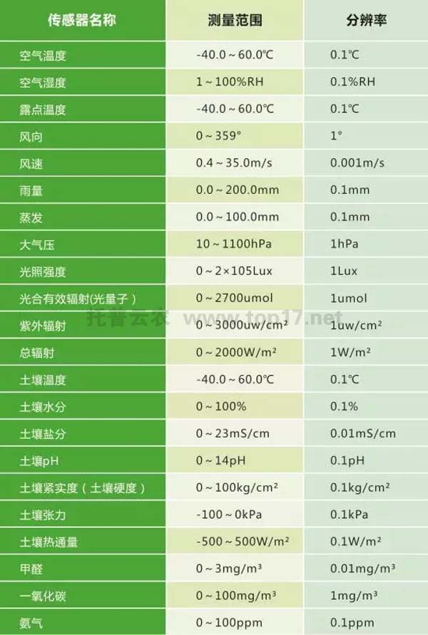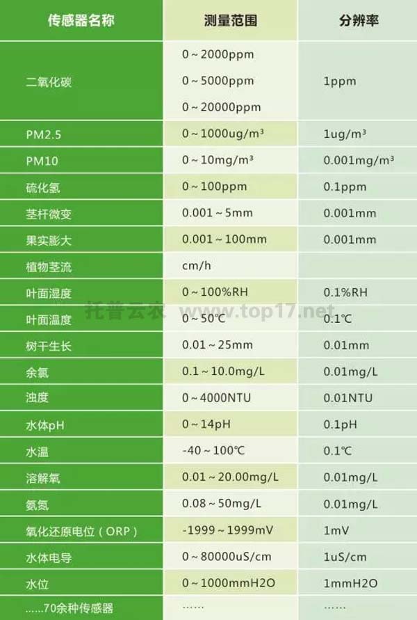 在農(nóng)業(yè)氣象方面,目前有空氣溫度、濕度、光照強(qiáng)度、光合有效輻射、二氧化碳、雨量、蒸發(fā)、風(fēng)速風(fēng)向、大氣壓、總輻射、紫外輻射等傳感器。同時,還有應(yīng)用于畜禽養(yǎng)殖監(jiān)測的氨氣、硫化氫等傳感器,應(yīng)用于水質(zhì)監(jiān)測的pH、余氯、濁度、溶解氧、氨氮、水溫等傳感器,應(yīng)用于環(huán)境監(jiān)測的一氧化碳、二氧化碳、甲醛、PM2.5、PM10等傳感器。