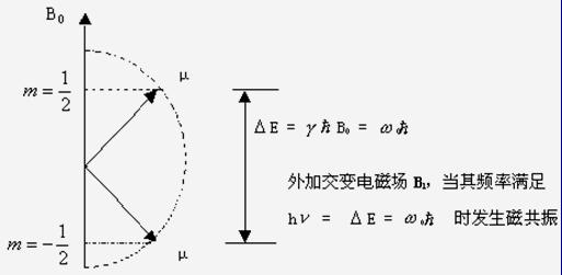 1H的自旋量子數(shù)是I=1/2,所以自旋磁量子數(shù)m=±1/2,即氫原子核在外磁場中應(yīng)有兩種取向。1H的兩種取向代表了兩種不同的能級, 因此1H發(fā)生核磁共振的條件是必須使電磁波的輻射頻率等于1H的進動頻率。