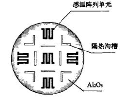 圖1是風(fēng)速風(fēng)向傳感器的加熱面。四個對稱分布的加熱陣列單元是加熱芯片,一般為鉑膜熱敏電阻,用于對稱地加熱芯片,使其高于周圍溫度。圖2是感溫陣列單元的陣列芯片,邊上四個呈對稱分布,中間一個芯片用于測量芯片的溫度。