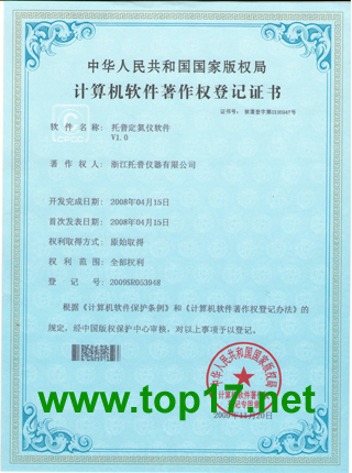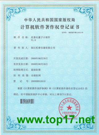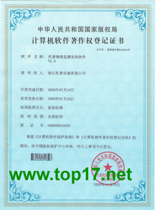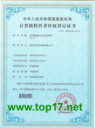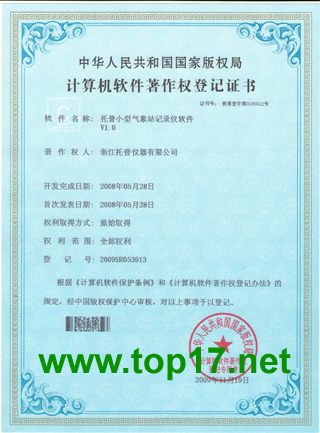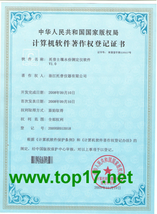 2009年,浙江托普儀器有限公司共獲得11項計算機(jī)軟件著作權(quán),并取得了由國家版權(quán)局頒發(fā)的相關(guān)計算機(jī)軟件著作權(quán)證書,除面積測量儀、土壤水分有機(jī)質(zhì)測量儀和農(nóng)業(yè)環(huán)境監(jiān)測系統(tǒng)外,另外8項軟件產(chǎn)品名稱分別為:定氮儀軟件V1.0,二氧化碳記錄儀軟件V1.0,風(fēng)向風(fēng)速記錄儀軟件V1.0,光量子計軟件V1.0,墑情監(jiān)測系統(tǒng)軟件V1.0,土壤水份測定儀軟件V1.0,溫濕光記錄儀軟件V1.0,小型氣象站記錄儀軟件V1.0八項軟件證書。