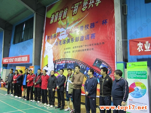 全國(guó)農(nóng)技中心杭大鵬書記主持開幕式,并參加了男單比賽;全國(guó)農(nóng)技中心陳生斗主任、浙江托普儀器有限公司陳渝陽總經(jīng)理、農(nóng)業(yè)部機(jī)關(guān)黨委唐珂書記先后致辭;農(nóng)業(yè)部農(nóng)墾局李偉國(guó)局長(zhǎng)作為參賽俱樂部代表進(jìn)行了發(fā)言。在眾位領(lǐng)導(dǎo)的激情發(fā)言下,第二屆農(nóng)業(yè)部“托普儀器”杯羽毛球俱樂部邀請(qǐng)賽正式拉開帷幕。