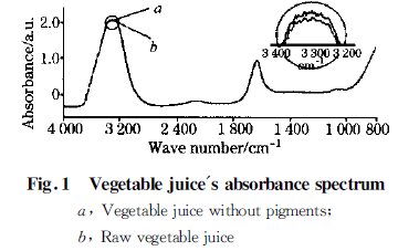 儀器參數(shù)設(shè)定:光譜采集范圍2 000 !200 cm-1 ,分辨率為1 cm-1 ,掃描次數(shù)為16 次。用濾紙過濾蔬菜汁,視過濾兩遍后顏色清澈的蔬菜汁不含色素。分別檢測(cè)蔬菜汁原汁及其經(jīng)濾紙過濾后不含色素情況下的光譜。