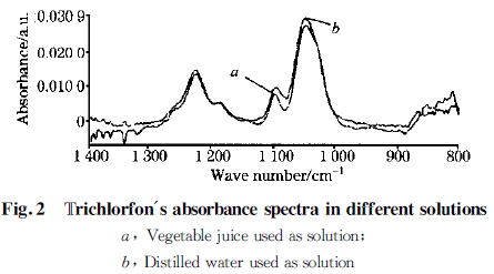 如圖2 所示?梢,敵百蟲的特征吸收峰位置在2 種溶劑中均能夠得到良好的反映。由常識(shí)可知,白菜葉片組織的絕大部分由水構(gòu)成,因此農(nóng)藥在蔬菜中的吸收應(yīng)與在水溶液中的基本相同。實(shí)驗(yàn)結(jié)果顯示,農(nóng)藥敵百蟲在2 種溶劑中的吸收峰位置完全吻合;在蔬菜汁中的吸光度略低于在蒸餾水溶液中的,可能是未濾除的蔬菜纖維等雜質(zhì)的吸收造成的影響。