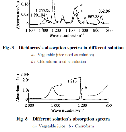 近似相同濃度(7 000(10 -6 ))的敵敵畏蔬菜汁溶液和氯仿溶液的吸光度數(shù)據(jù)如圖3 所示。由實(shí)驗(yàn)結(jié)果可見,敵敵畏在蔬菜汁溶劑下的吸收峰位置能夠與中紅外的特征吸收一一對(duì)應(yīng)( 見表1 ),而在氯仿溶劑下,1 259. 2 cm-1 處和863. 4cm-1 處的峰位置發(fā)生了偏移。這是由于溶劑氯仿的極性較強(qiáng),其氫鍵影響了敵敵畏的基團(tuán)吸收頻率,造成敵敵畏的吸收峰位置發(fā)生移動(dòng)。此外,2 條吸光度曲線并不重合。這除了上述蔬菜中雜質(zhì)吸收的原因外,分析2 種溶劑本身的透光能力可看到,蔬菜汁在1 400 !800 cm-1 波段(除1 215cm-1 附近外)的吸收比氯仿強(qiáng)許多(見圖4 )。因此扣除溶劑背景時(shí),敵敵畏在蔬菜汁中的吸光度低于在氯仿中的吸光度。