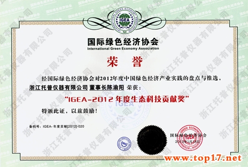浙江托普儀器有限公司陳渝陽總經(jīng)理應邀出席此次會議,并榮獲由國際綠色經(jīng)濟協(xié)會頒發(fā)的“IGEA—2012年度生態(tài)科技貢獻獎”,此獎項是經(jīng)國際綠色經(jīng)濟協(xié)會對2012年度中國綠色經(jīng)濟產(chǎn)業(yè)時間的盤點與推選而獲得。