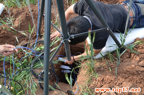 圖為:托普儀器技術(shù)人員現(xiàn)場安裝土壤水分溫度定點檢測及遠(yuǎn)程傳輸系統(tǒng)