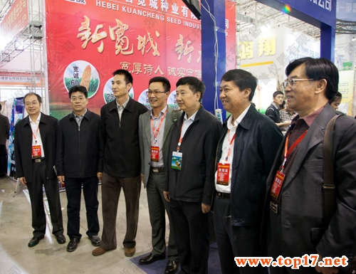 圖為:托普總經(jīng)理陳渝陽先生引領農(nóng)業(yè)部種子管理局張延秋局長(右二),吉林農(nóng)委李國強主任,全國農(nóng)技推廣服務中心黨委杭大鵬(右四)書記等領導參觀公司展臺