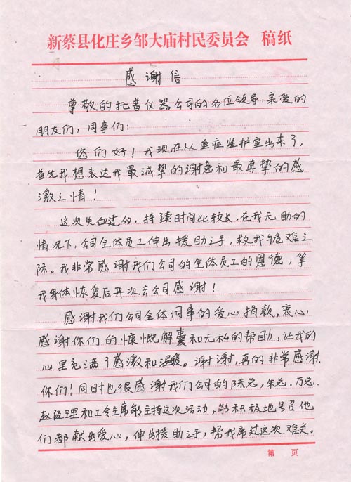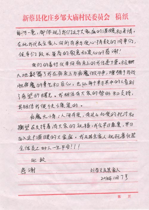 1月15日,公司收到劉學(xué)義寫(xiě)來(lái)的信,信中他告訴托普家人他的病情已好轉(zhuǎn),術(shù)后已由重癥監(jiān)護(hù)室轉(zhuǎn)入普通病房,等待觀察與休養(yǎng)。長(zhǎng)長(zhǎng)的一封信,給同事們帶來(lái)了喜悅的消息,也傾訴著他對(duì)托普家人的深深謝意!