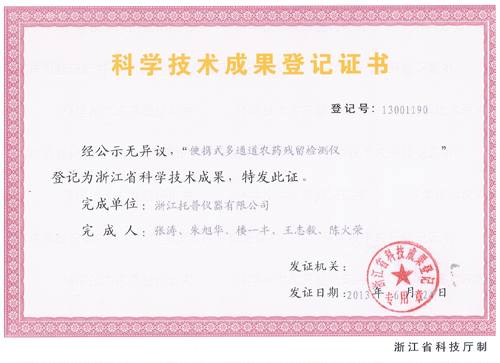 熱烈祝賀托普便攜式多通道農(nóng)藥殘留檢測儀獲得科學技術(shù)成果登記證書