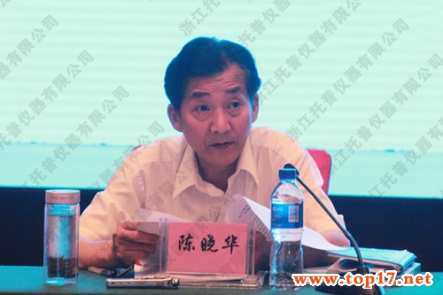 圖為:陳曉華副部長蒞臨托普儀器展臺觀摩并與朱旭華副總經(jīng)理合影