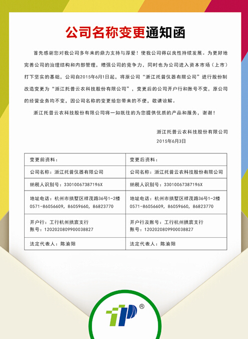 PS:浙江托普云農(nóng)科技股份有限公司注冊資金由原來的1000萬變更為5000萬,公司經(jīng)營業(yè)務(wù)不變,公司開戶行和賬號等均不變,托普云農(nóng)將一如既往的為您提供優(yōu)質(zhì)的產(chǎn)品及服務(wù)!