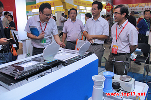 圖為:張延秋局長(左二)、陳生斗主任(左四)、杭大鵬書記(左一)一行蒞臨托普展區(qū)