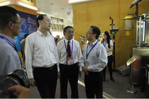 圖為:余欣榮副部長(zhǎng)和王小兵副司長(zhǎng)一行蒞臨托普展區(qū)