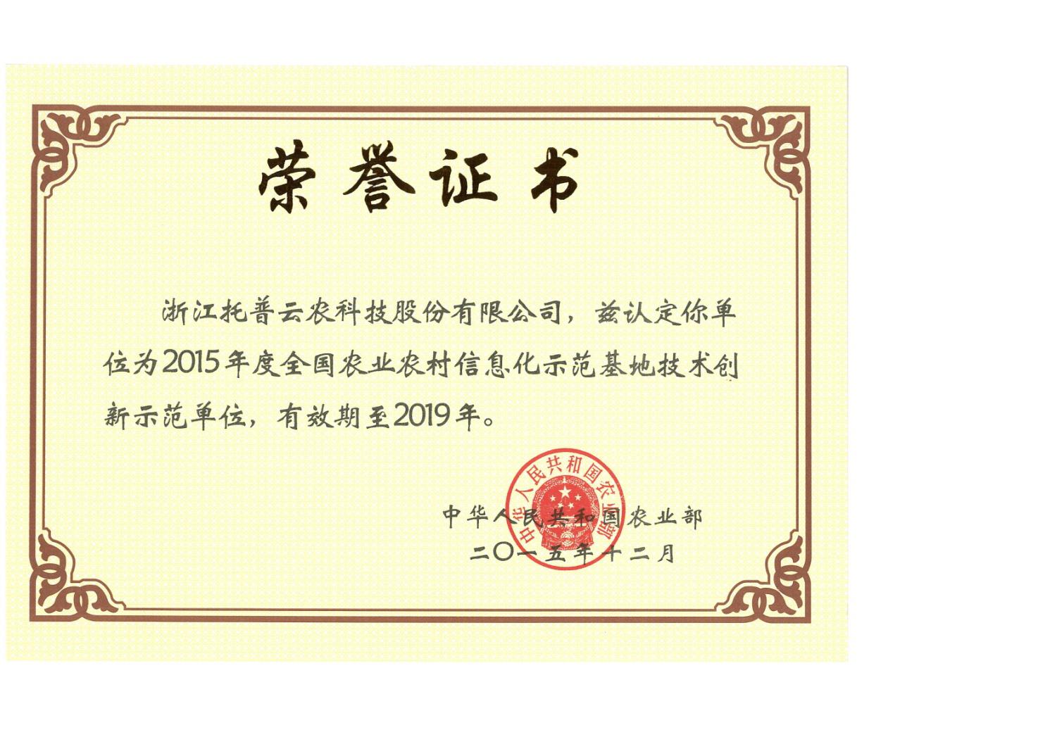 2015年12月9日,農(nóng)業(yè)部發(fā)文公布《農(nóng)業(yè)部關于認定2015年度全國農(nóng)業(yè)農(nóng)村信息化示范基地的通知》,浙江托普云農(nóng)科技股份有限公司獲批技術創(chuàng)新型示范單位!锻ㄖ芬蟾魇痉痘,秉持創(chuàng)新、協(xié)調(diào)、綠色、開放、共享的發(fā)展理念,積極推進“互聯(lián)網(wǎng)+”現(xiàn)代農(nóng)業(yè)行動,大力發(fā)展農(nóng)業(yè),切實抓好農(nóng)業(yè)電子商務、農(nóng)業(yè)物聯(lián)網(wǎng)、農(nóng)業(yè)農(nóng)村大數(shù)據(jù)、農(nóng)業(yè)信息服務等重點工作,大膽探索創(chuàng)新,充分發(fā)揮示范引領作用,為推進農(nóng)業(yè)現(xiàn)代化作出新貢獻。