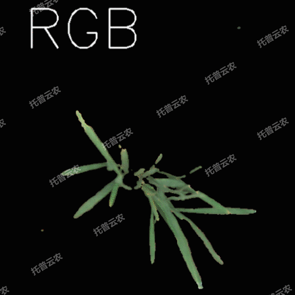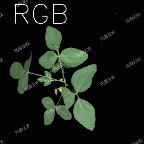 可見光二維成像單元:獲取植株側(cè)視可見光圖像,并利用人工智能算法分析獲取株高、葉頂點數(shù)、投影面積等形態(tài)參數(shù),黃色投影面積、綠色投影面積等顏色參數(shù),以及平滑度等紋理參數(shù),用于植株株型與健康狀態(tài)相關表型分析。