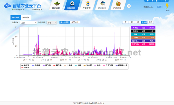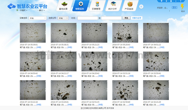 系統(tǒng)通過搭建在田間的智能蟲情監(jiān)測設(shè)備,可以無公害誘捕殺蟲,綠色環(huán)保,同時(shí)利用GPRS/3G移動(dòng)無線網(wǎng)路,定時(shí)采集現(xiàn)場圖像,自動(dòng)上傳到遠(yuǎn)端的物聯(lián)網(wǎng)監(jiān)控服務(wù)平臺(tái),工作人員可隨時(shí)遠(yuǎn)程了解田間蟲情情況與變化,制定防治措施。通過系統(tǒng)設(shè)置或遠(yuǎn)程設(shè)置后自動(dòng)拍照將現(xiàn)場拍攝的圖片無線發(fā)送至監(jiān)測平臺(tái),平臺(tái)自動(dòng)記錄每天采集數(shù)據(jù),形成蟲害數(shù)據(jù)庫,可以各種圖表、列表形式展現(xiàn)給農(nóng)業(yè)專家進(jìn)行遠(yuǎn)程診斷。