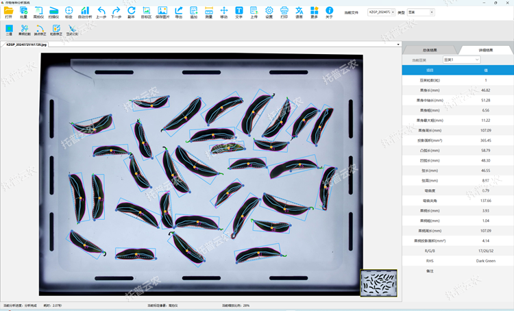 6.粒型指標(biāo)分析:可用于≥30種水稻、小麥、玉米、大豆、高粱、谷子、油菜,蔬菜、花卉等同粒型種子的粒型指標(biāo)分析,可對(duì)每一粒籽粒分析計(jì)算,分析種子的詳細(xì)結(jié)果:自動(dòng)檢測(cè)單粒種子的粒型參數(shù)(長(zhǎng)、寬、長(zhǎng)寬比、面積、周長(zhǎng))。也可分析各類種子總結(jié)果:所有種子的總粒數(shù)、千粒重/百粒重、粒色、平均值(長(zhǎng)、寬、長(zhǎng)寬比、面積、周長(zhǎng))、標(biāo)準(zhǔn)差,半自動(dòng)檢測(cè)容重、水分,并可并輸出種子大小排列對(duì)比圖