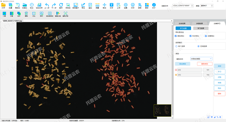 14.智能對(duì)比:能精準(zhǔn)顯示種粒外接矩形,對(duì)不同品種的種子進(jìn)行長(zhǎng)和寬的對(duì)比,并輸出排列、對(duì)比圖。深度學(xué)習(xí):根據(jù)顏色或是形狀的不同對(duì)種子進(jìn)行自學(xué)習(xí)和再學(xué)習(xí),并實(shí)現(xiàn)自動(dòng)分類識(shí)別。