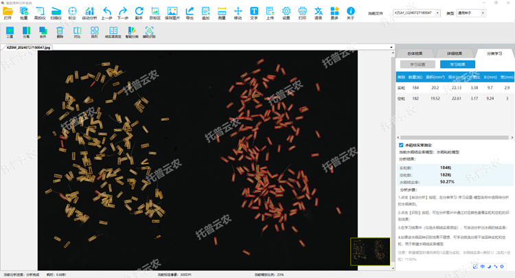 2.水稻結(jié)實(shí)率分析:能精準(zhǔn)顯示種粒外接矩形,得出空粒數(shù),實(shí)粒數(shù),結(jié)實(shí)率百分比數(shù)據(jù),并可直接標(biāo)記空粒、實(shí)粒,顯示各籽粒粒型數(shù)據(jù)(長(zhǎng)、寬、長(zhǎng)寬比、面積、周長(zhǎng)),可預(yù)設(shè)水稻粳粒結(jié)實(shí)率模型和水稻秈粒結(jié)實(shí)率模型,并支持根據(jù)自己的品種重新學(xué)習(xí)建模。
